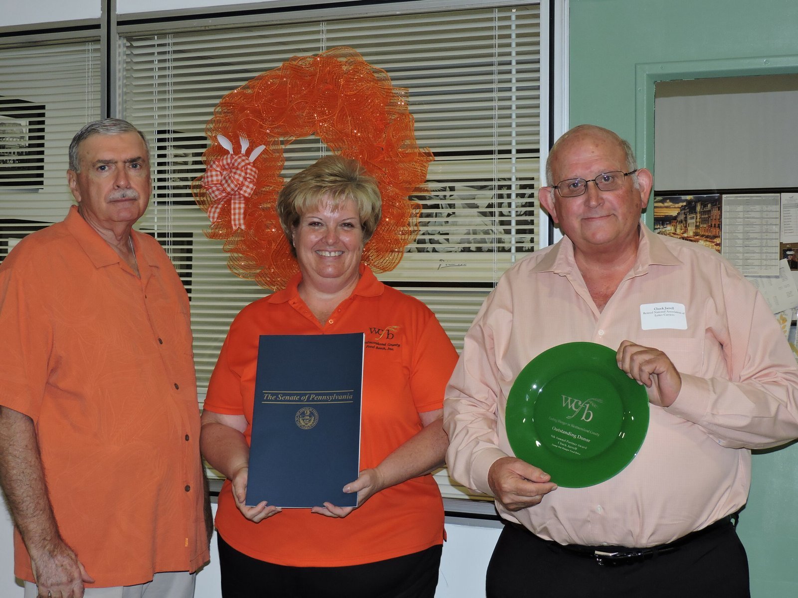 DSCN0858Chuck Jarrell of Irwin has been a true advocate for the Westmoreland County Food Bank, as well as, other food banks throughout Southwestern Pennsylvania.  He recently retired as a letter carrier for many years.  He still spends time at the National Association of Letter Carriers (NALC) office in Pittsburgh, a coordinator for the annual Stamp Out Hunger Food Drive for Branch 84.  He has taken on the task of increasing the amount of food received during the annual food drive, by promoting the use of bags for marketing for the past two years.  In the past, only a postcard would market the drive, paid for by the NALC.  After reading articles across the nation about food increases due to the use of bags, he was determined to make it happen here in our community.